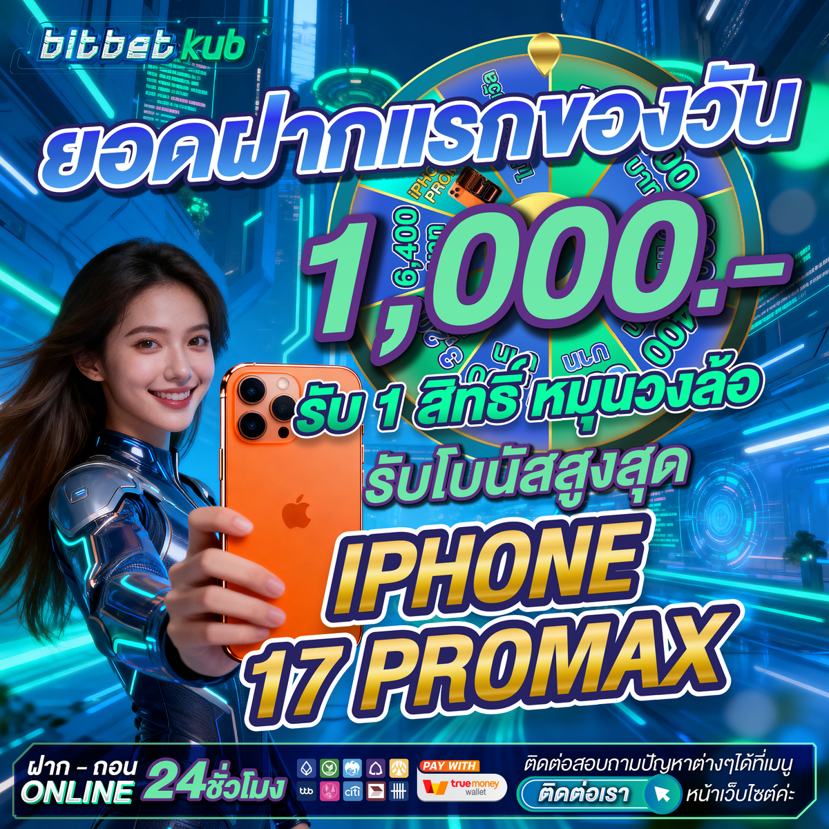 💗 ยอดฝากแรกของวัน 1000 บาท รับ 1 สิทธิ์ หมุนกงล้อ ลุ้นโบนัสสูงสุด IPhone 17 PROMAX จำนวน 1 เครื่อง