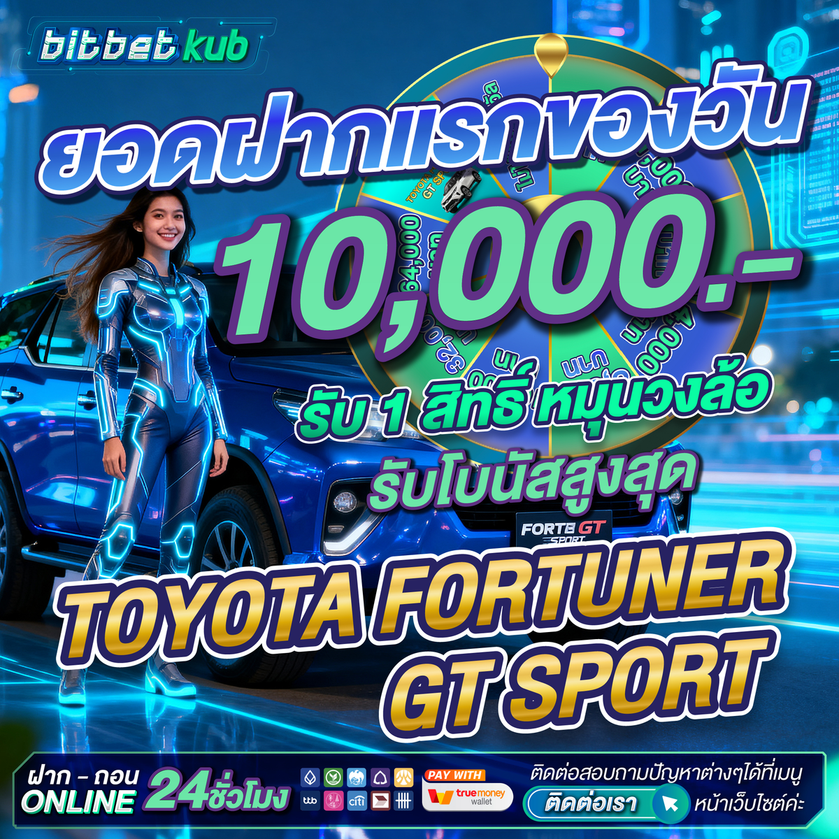 💗 ยอดฝากแรกของวัน 10000 บาท รับ 1 สิทธิ์ หมุนกงล้อ ลุ้นโบนัสสูงสุด รถยนต์ Fortuner Gr Sport 1 คัน